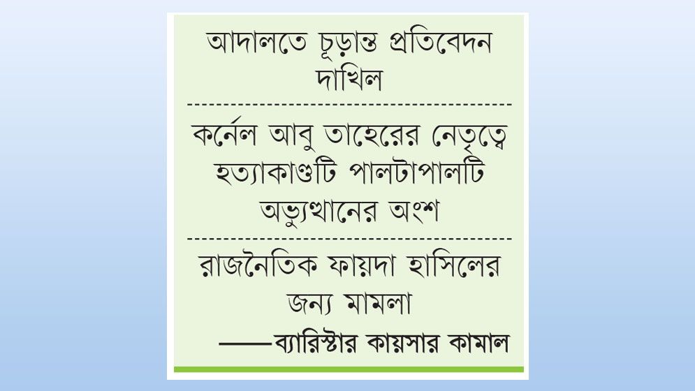 তবে সামরিক আদালতে সেনা কর্মকর্তা হত্যার দায়ে ইতোমধ্যেই লে. কর্নেল আবু তাহেরের মৃত্যুদণ্ড কার্যকর হওয়ায়, অপরাধ সত্য প্রমাণিত হলেও তার বিরুদ্ধে চার্জশিট দেওয়া হয়নি।