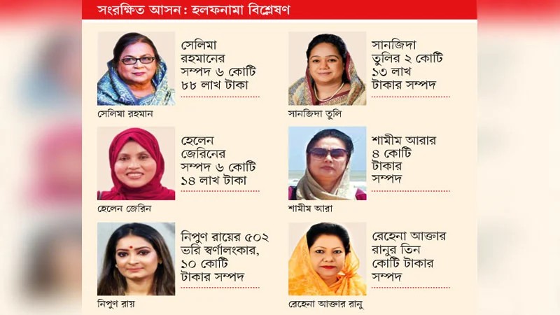 হলফনামা অনুযায়ী, বিএনপি জোটের ১৬ কোটিপতি প্রার্থী হচ্ছেন– সেলিমা রহমান, শিরীন সুলতানা, নিপুণ রায় চৌধুরী, শওকত আরা আক্তার, ফাহিমা নাসরিন, সুলতানা আহমেদ, বীথিকা বিনতে হোসাইন, ফেরদৌসী আহমেদ, শামীম আরা বেগম স্বপ্না, আন্না মিন্জ, সানজিদা ইসলাম তুলি, সাবিরা সুলতানা, মাহমুদা হাবীবা, হেলেন জেরিন খান, নেওয়াজ হালিমা আরলী এবং রাশেদা বেগম হিরা। তাদের মধ্যে কয়েকজনের সম্পদের পরিমাণ দুই থেকে ছয় কোটি টাকার মধ্যে।